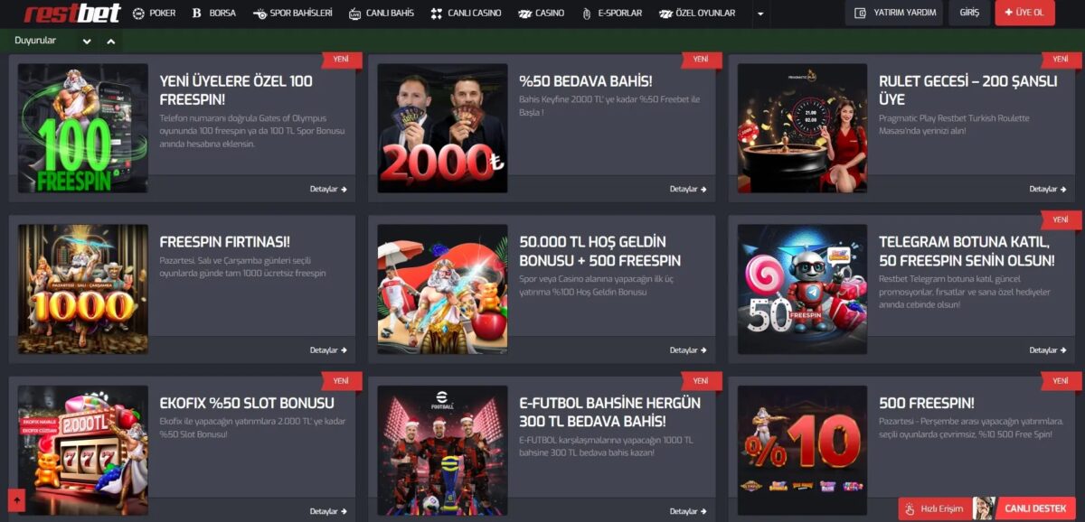 Saygıdeğer oyuncularımız, Restbet giriş adresini duyurdu. Restbet giriş aşamasından sonra haftalık promosyonlara katılabilirsiniz.